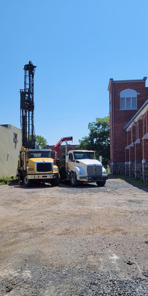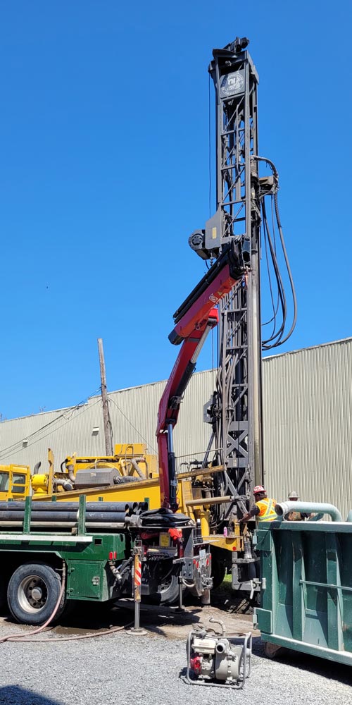 Le processus du forage des puits débute avec un camion de forage qui utilise une longue tige rotative afin de percer le sol et d’installer le tubage, soit la paroi du puits. Ce forage est réalisé avec de l'eau et de l'air afin de faire remonter à la surface les débris rocheux, assurant une progression constante.